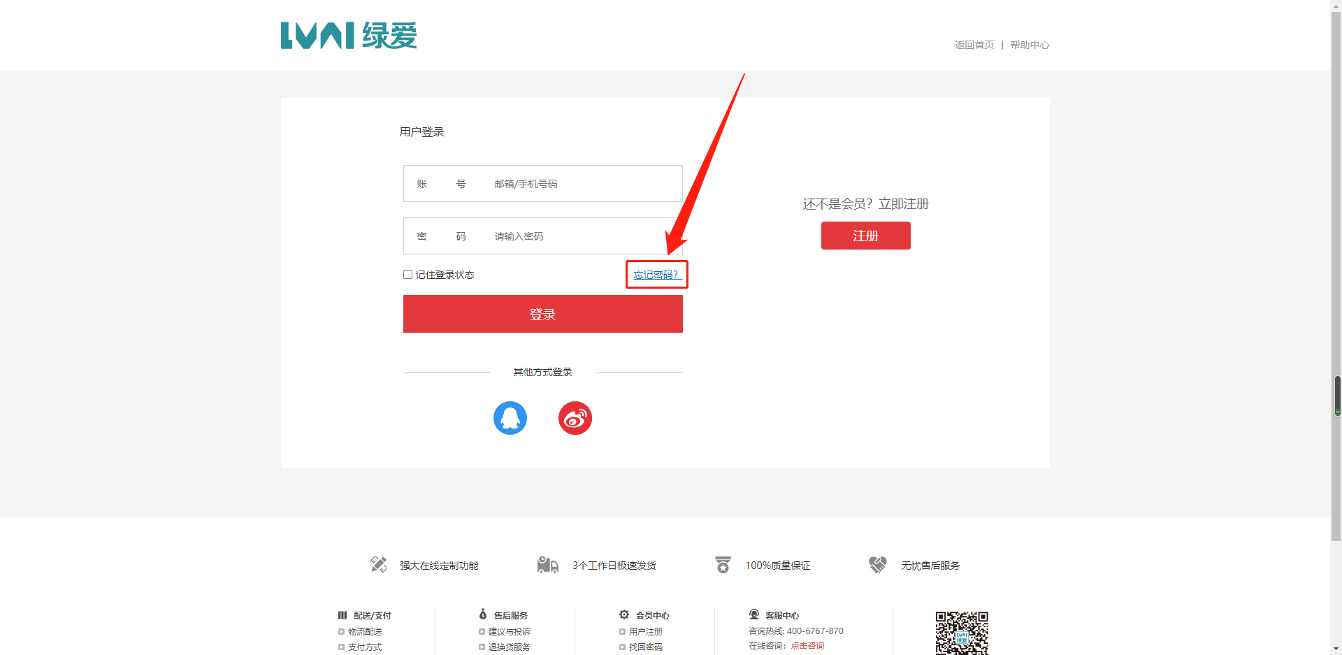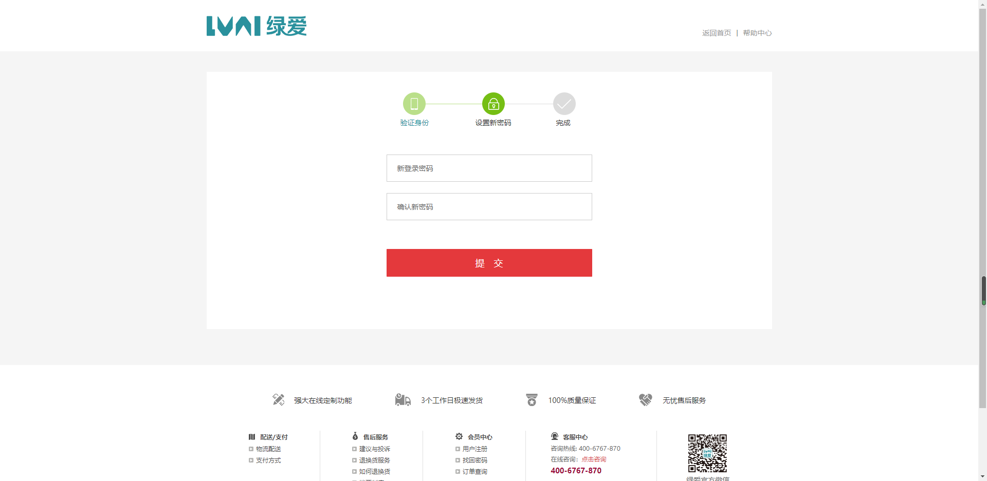 1、打開綠愛網(wǎng)站首頁,點擊右上角“登陸”,如下圖所示 2、在登錄頁面中點擊“忘記密碼”,如下圖所示 3、在密碼找回頁面輸入輸入手機號,點擊“發(fā)送驗證碼”,手機收到驗證碼后,在頁面中輸入驗證碼,點擊“提交”按鈕,如下圖所示 4、設置新密碼。輸入的“新登錄密碼”和“確認登陸密碼”要一致。點擊“提交”按鈕,如下圖所示。 5、完成上一步操作后,如果出現(xiàn)以下頁面,則密碼重置成功.