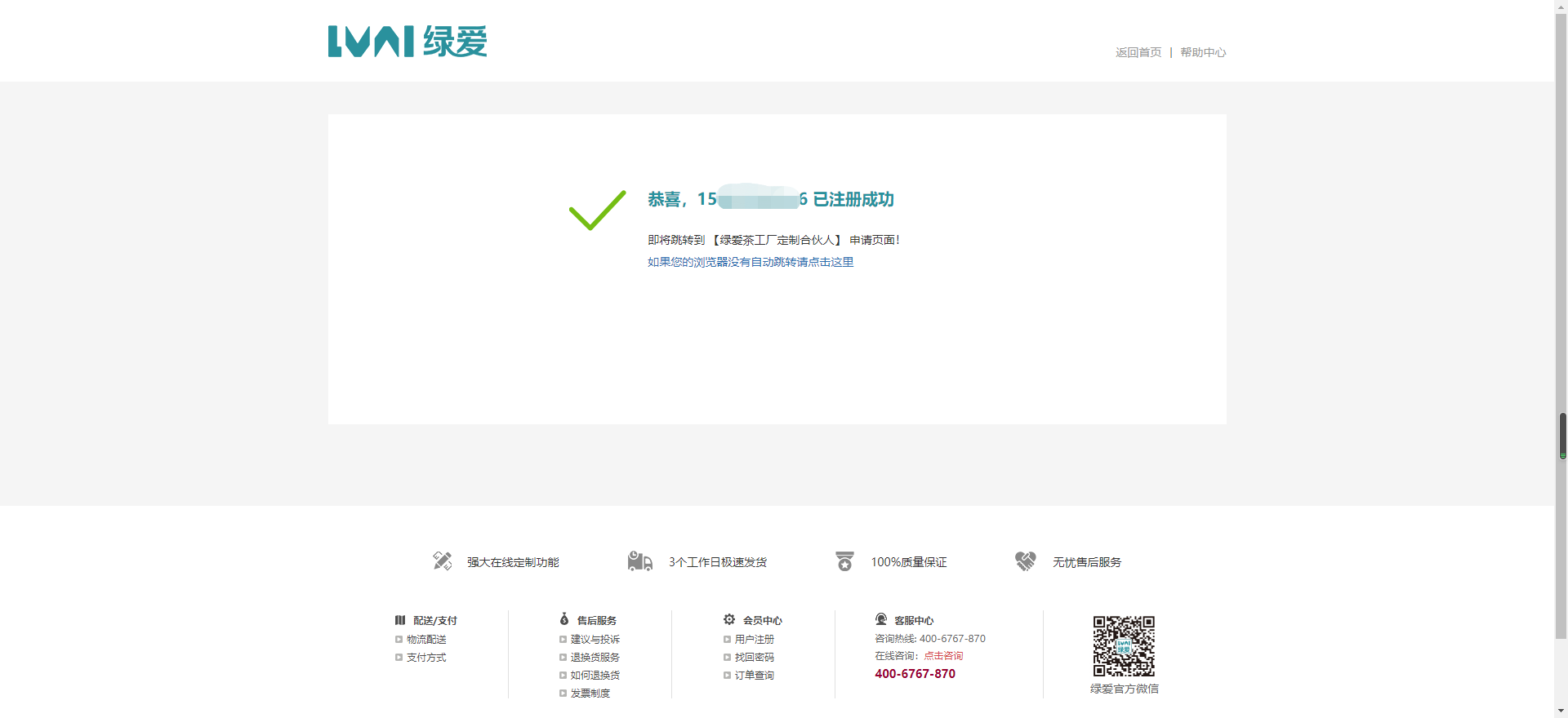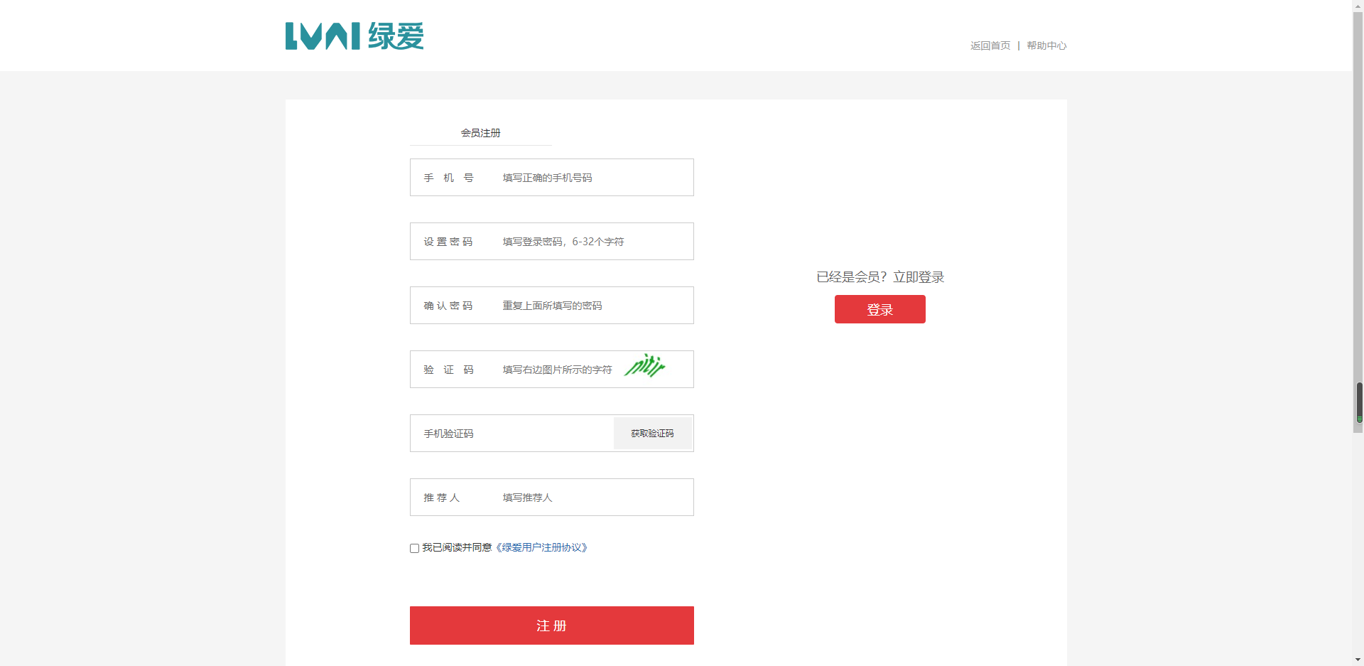 1、打開綠愛網站首頁,點擊右上角“注冊”,進入注冊頁面,如下圖所示 2、在注冊頁面依次輸入手機號、密碼、確認密碼、驗證碼、手機驗證碼、推薦人、勾選“我已閱讀并同意《綠愛用戶注冊協議》”,如下圖所示: 其中手機驗證碼需要點擊獲取驗證碼按鈕來獲取;推薦人需要填寫真實有效的推薦人姓名,如果沒有推薦人姓名,請聯系與您對接的銷售。 全部信息填寫無誤后,請點擊記最下方的紅色“注冊”按鈕。 3、如出現以下界面,則說明注冊成功。